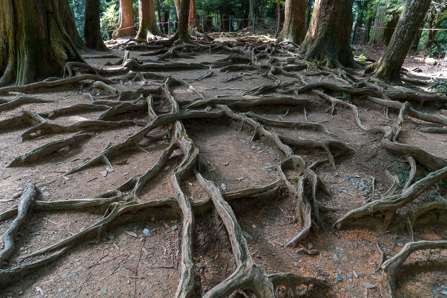 牛若丸が兵法修行をしたと伝えられる「木の根道」。