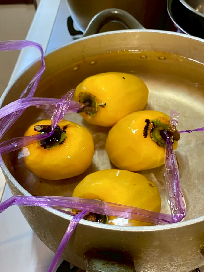 紫色のビニール紐にくるくると結ばれて、鍋の中にぷかぷかと浮かぶ柿たち。